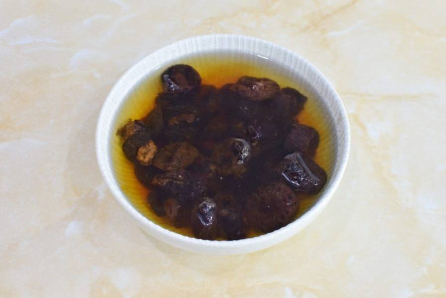 Предварительно залейте кипятком чернослив и оставьте постоять на 15-20 минут. За это время он станет мягче. Затем воду слейте, а чернослив промойте.