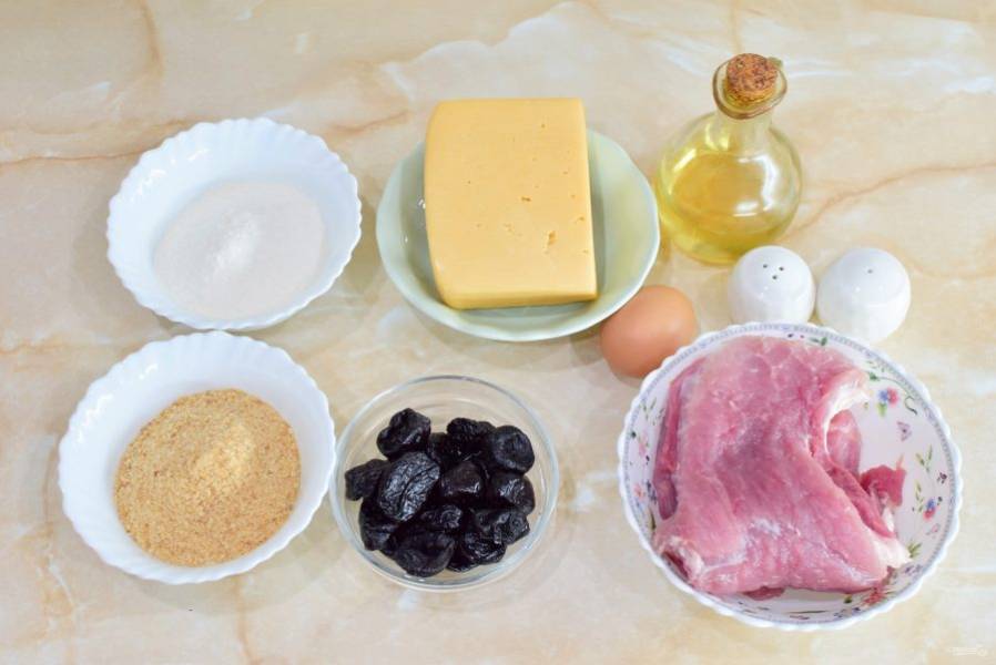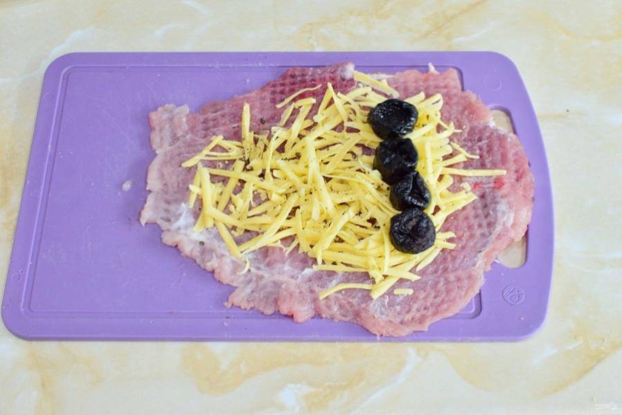 На отбитое мясо разложите тертый сыр и несколько кусочков чернослива.