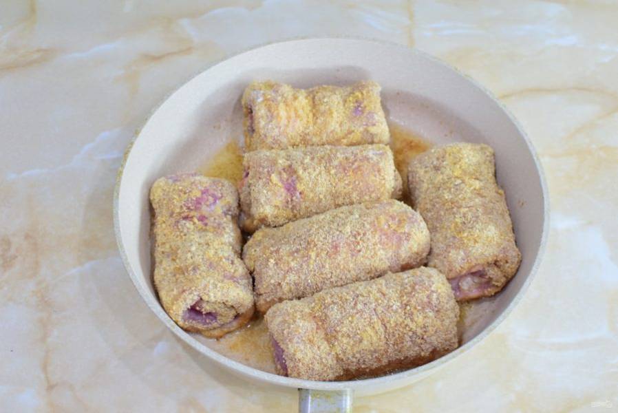 Для жарки разогрейте сковороду и налейте на неё масло. Выложите рулеты швом вниз. Обжарьте со всех сторон.