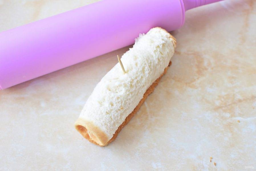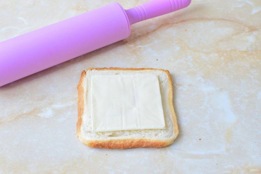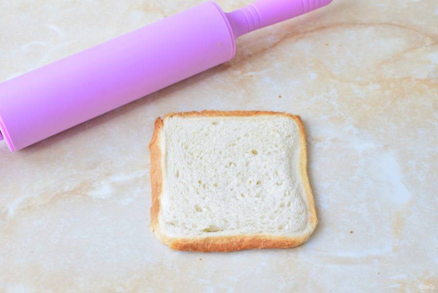 Каждый ломтик тостового хлеба раскатайте скалкой, чтобы он стал тоненький.