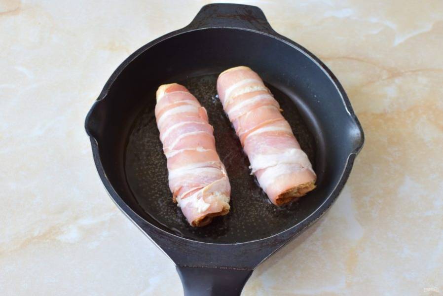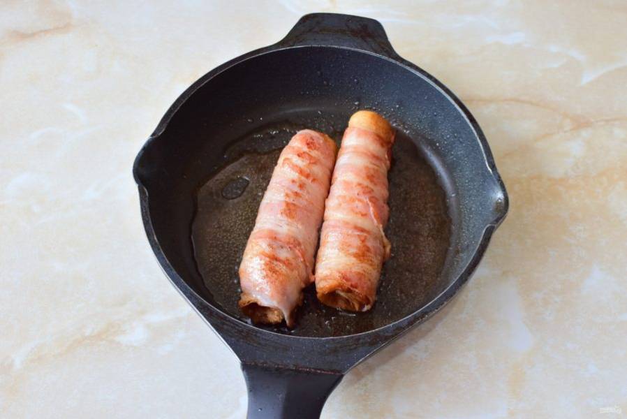 На горячую сковороду налейте немного растительного масла и обжарьте рулетики со всех сторон.
