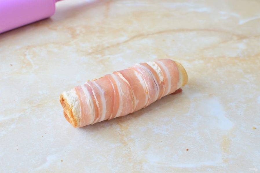 Готовые рулетики в беконе сразу подавайте к столу. В горячих рулетах сыр будет расплавленный.