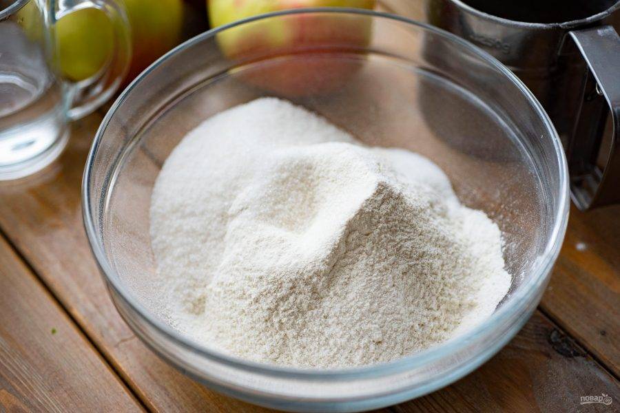 - Мука 270 грамм 250 грамм — в тесто, 20 грамм — в яблочную начинку