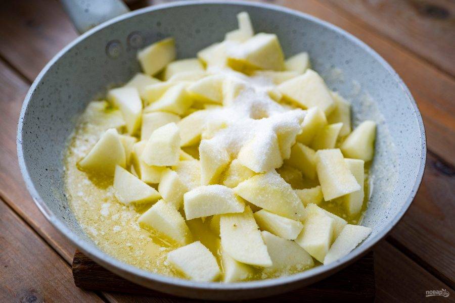 Пока тесто отдыхает, займитесь начинкой. С трех яблок снимите кожицу, удалите семенной отдел. Яблочную мякоть нарежьте небольшими кусочками и выложите в сковороду с уже растопленным на маленьком огне сливочным маслом. К яблокам добавьте сахар (80 грамм).
