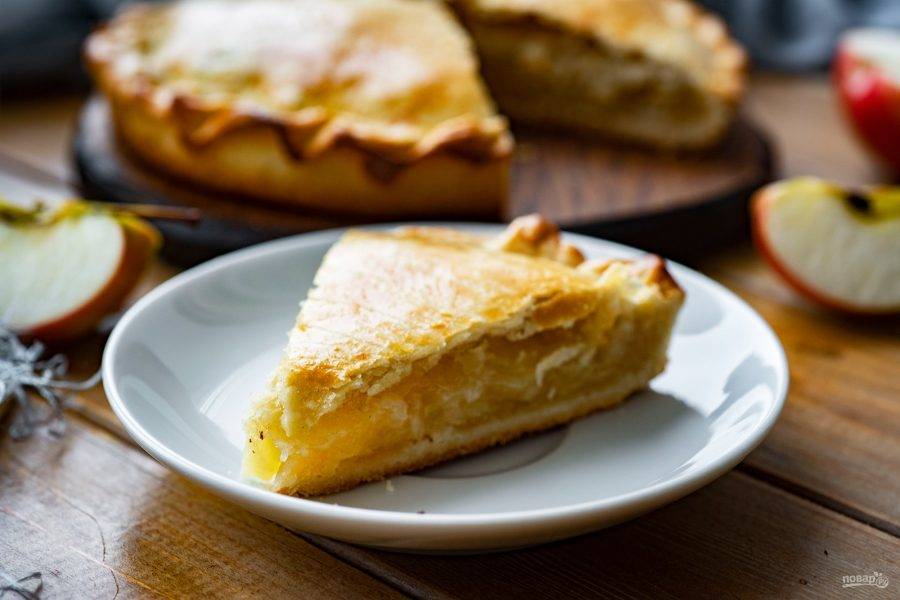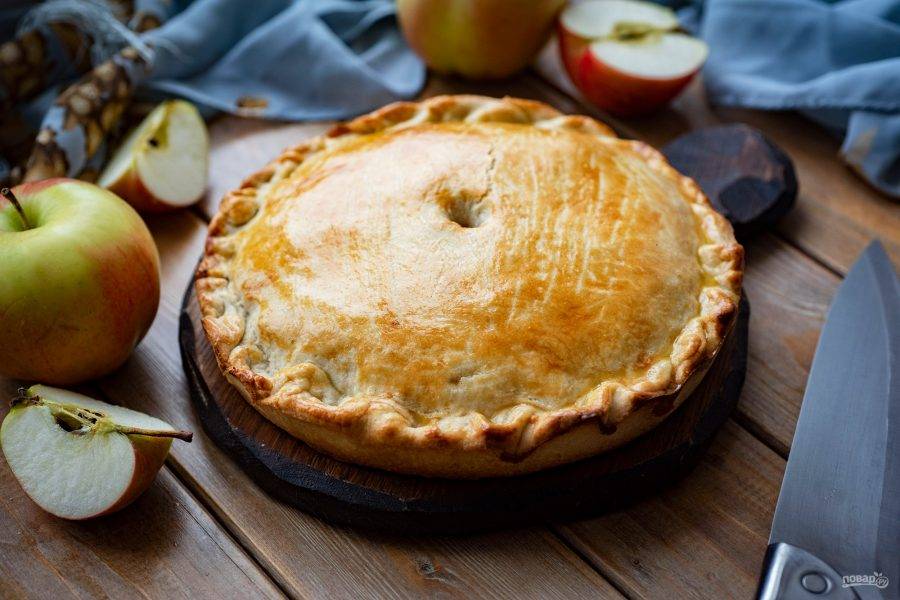 Затем раскатайте меньшую часть теста в круг, которым накройте яблочную начинку и защепите края теста пальцами, формируя заготовку пирога. Обязательно сделайте в центре небольшое круглое отверстие для выхода пара. Выпекайте пирог в уже разогретой до 180 градусов духовке примерно 45 минут.