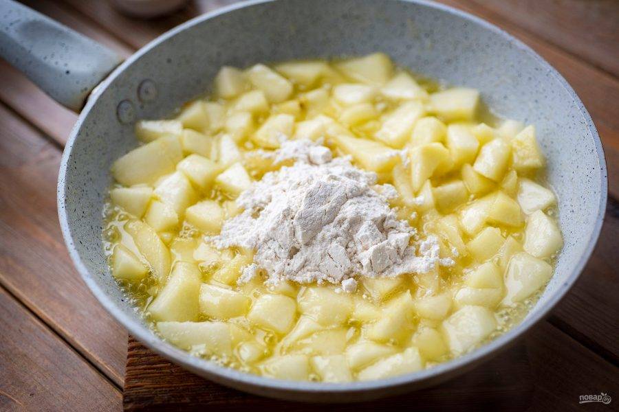 Томите яблоки на небольшом огне примерно 15 минут, они должны стать мягкими. Затем добавьте к ним муку (20 грамм). Это делается, чтобы загустить яблочную начинку. Помешивая, тушите все вместе еще 5 минут, после чего снимите сковороду с готовой начинкой с плиты.