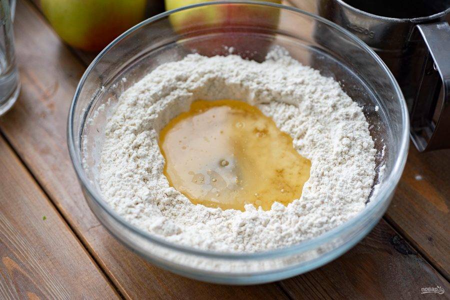 Добавьте к просеянной муке растительное масло и ледяную воду.