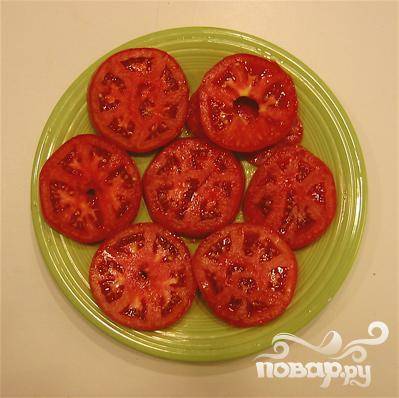 2. Помидор помойте, отряхните от воды и порежьте тонкими кружочками.