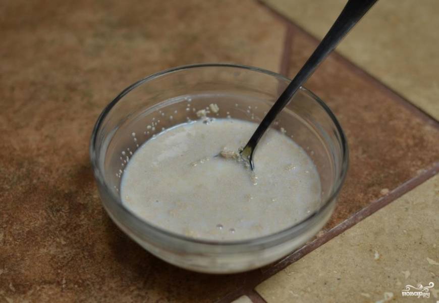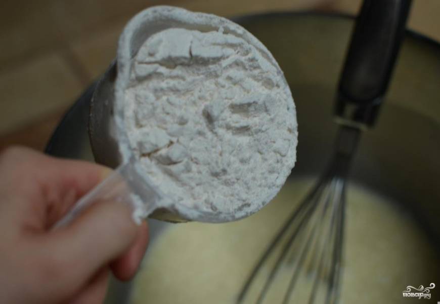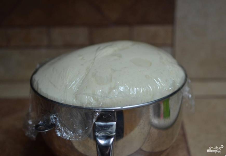 Добавляем одну чашку муки, взбиваем и затем накрываем полотенцем и даем постоять тесту при комнатной температуре около часа.