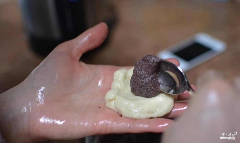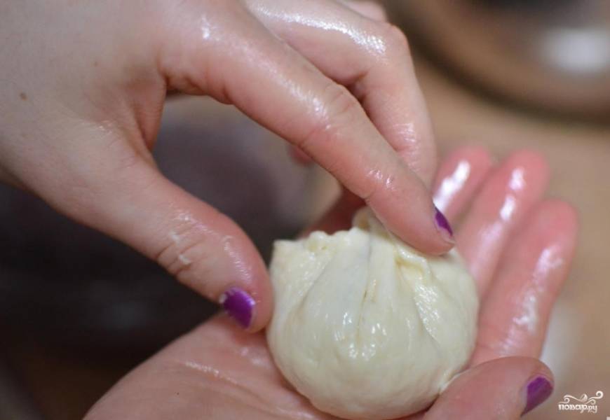 Тесто формируем руками, смазанными маслом. Однако не стоит сильно увлекаться маслом, иначе пончики не слепятся. Итак, начинку залепляем и из теста формируем красивый круглый и гладкий шарик.