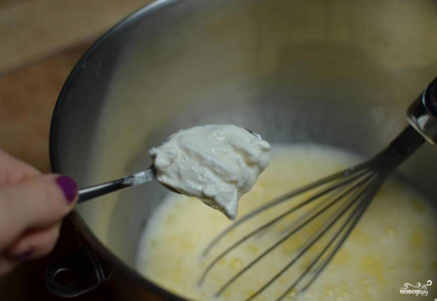 Вливаем масло, добавляем сметану, ванилин. Взбиваем.