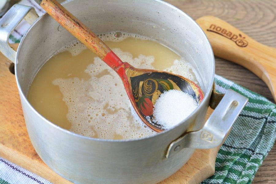 Овсяный кисель поставьте на огонь, добавьте сахар и соль по вкусу.