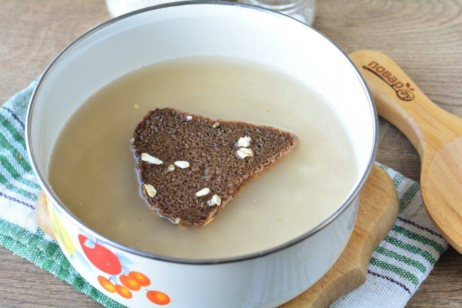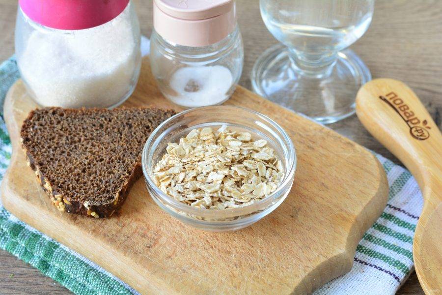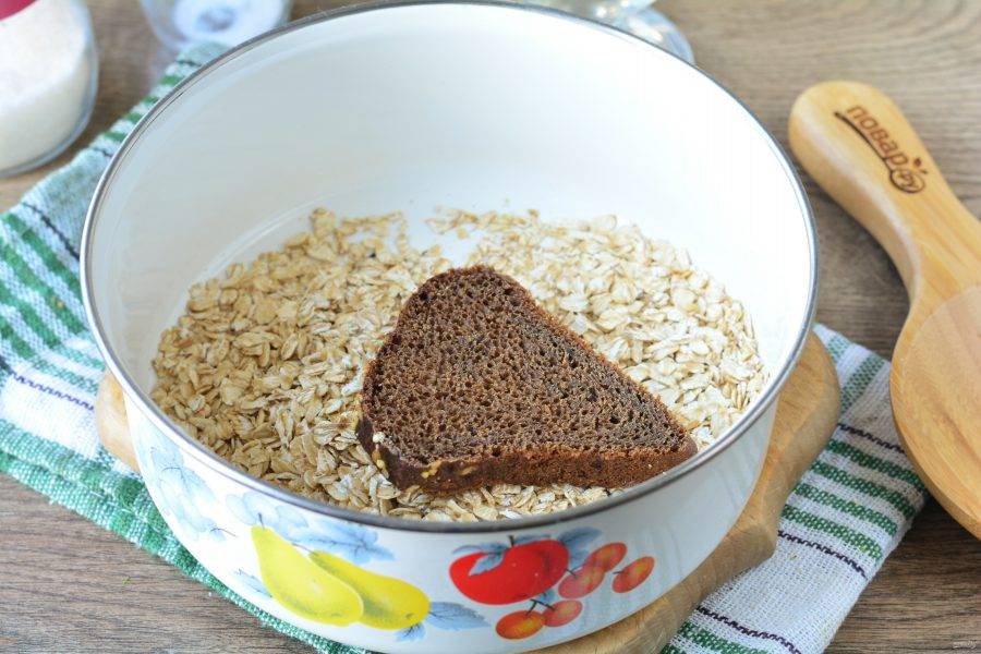 В глубокую емкость всыпьте овсяные хлопья и выложите кусочек ржаного хлеба.
