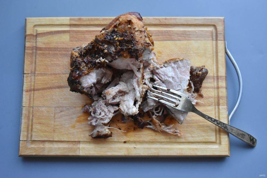 Томленое мясо извлеките из казана, выложите на доску и разберите с помощью двух вилок на волокна.