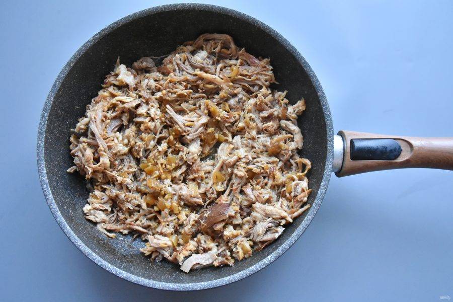 Для придания мясу хрустящей корочки обжарьте разобранную на волокна свинину в сковороде. Для сочности влейте в мясо часть соуса, оставшегося после тушения мяса.