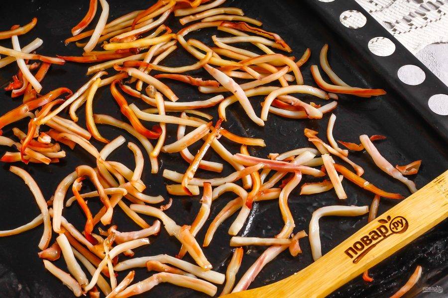 Слегка смажьте растительным маслом противень и выложите на него нарезанные полоски кальмаров. Прогрейте духовку до 50-60 градусов и высушите кальмаров примерно 1,5 часа, оставляя дверцу техники слегка приоткрытой.