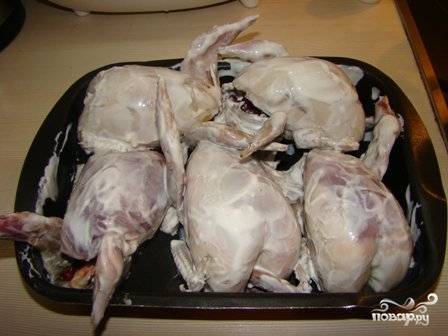 Начиняем брюшка каждой птицы брусникой с маслом. Посыпаем солью с перцем и обмазываем сметаной. Можно связать тушки ниткой для компактности.