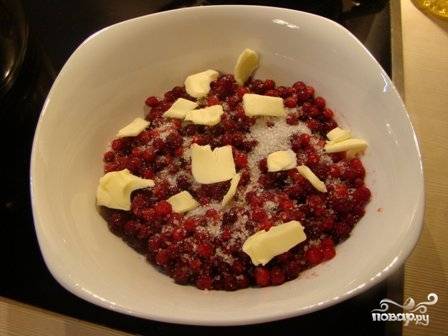 Бруснику смешаем с сахаром и кубиками сливочного масла.