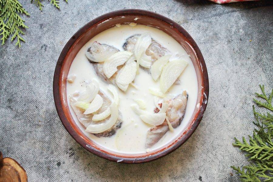 Молоко посолите, перемешайте до растворения и залейте им рыбу.