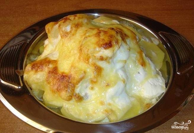 Посыпать тертым сыром, залить сметаной и отправить в разогретую до 220С духовку на 15-20 минут.