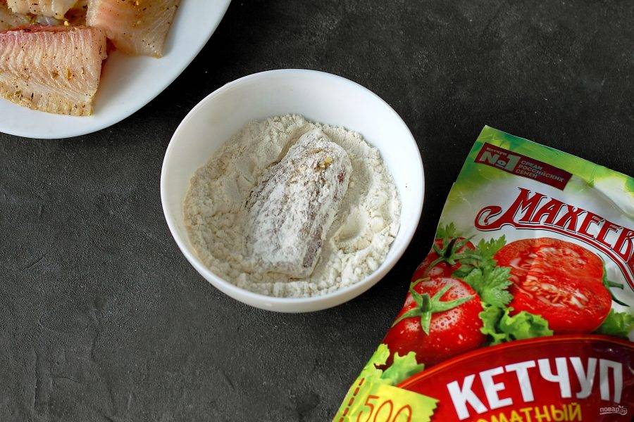 Затем, каждый кусочек рыбы обваляйте в муке.
