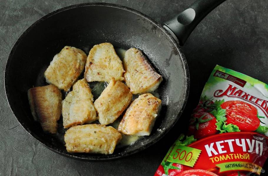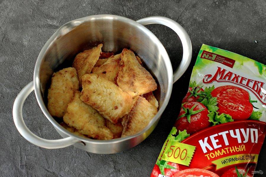 Переложите обжаренную рыбу в небольшую кастрюльку.