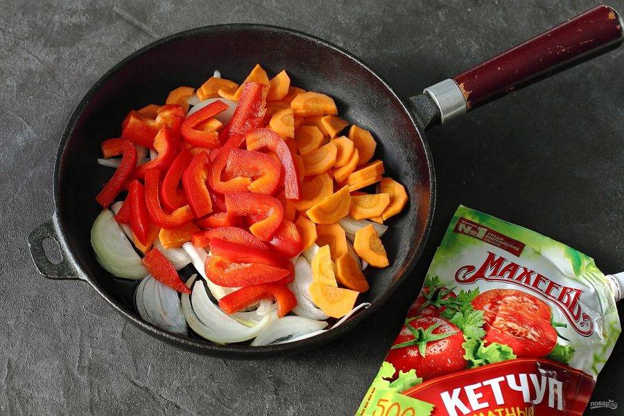 На сковороду налейте масло. Положите нарезанный перьями лук, нарезанный небольшой соломкой перец и морковь, нарезанную соломкой или полукружьями.