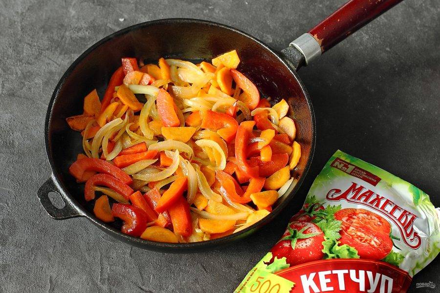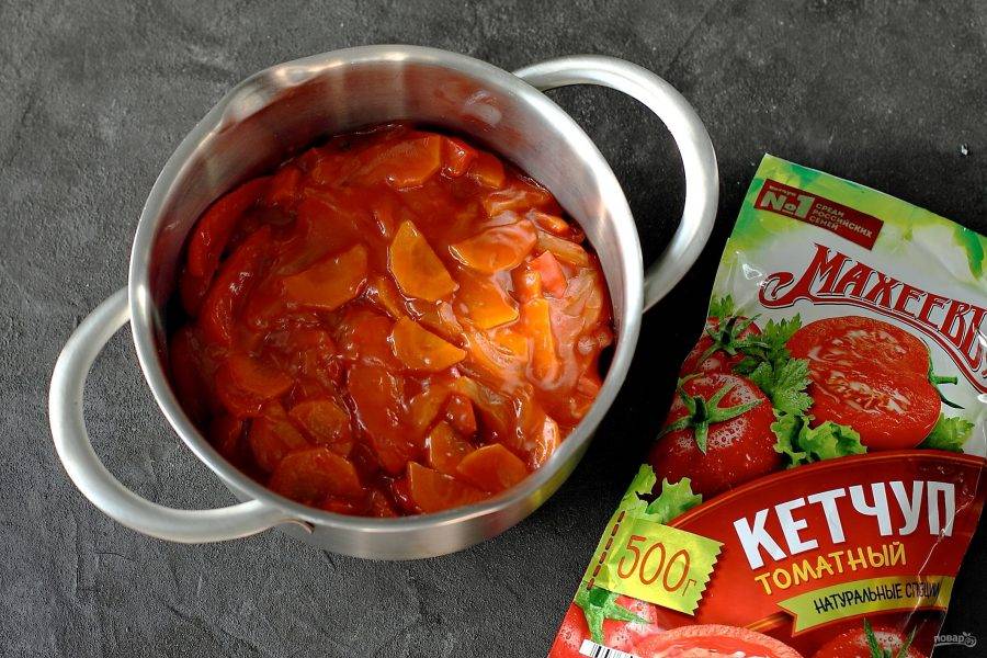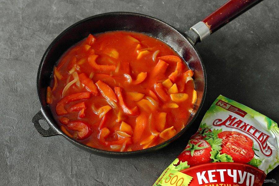 Добавьте томатный соус. Откорректируйте на соль. Если необходимо, то можно добавить немного сахара. Доведите до кипения, выдержите пару минут и снимите с огня.
