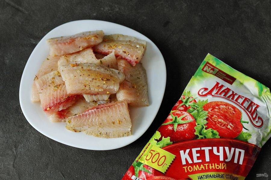 Рыбу промойте, обсушите и нарежьте на порционные кусочки. Каждый кусочек натрите со всех сторон солью и специями и оставьте на 15 минут.