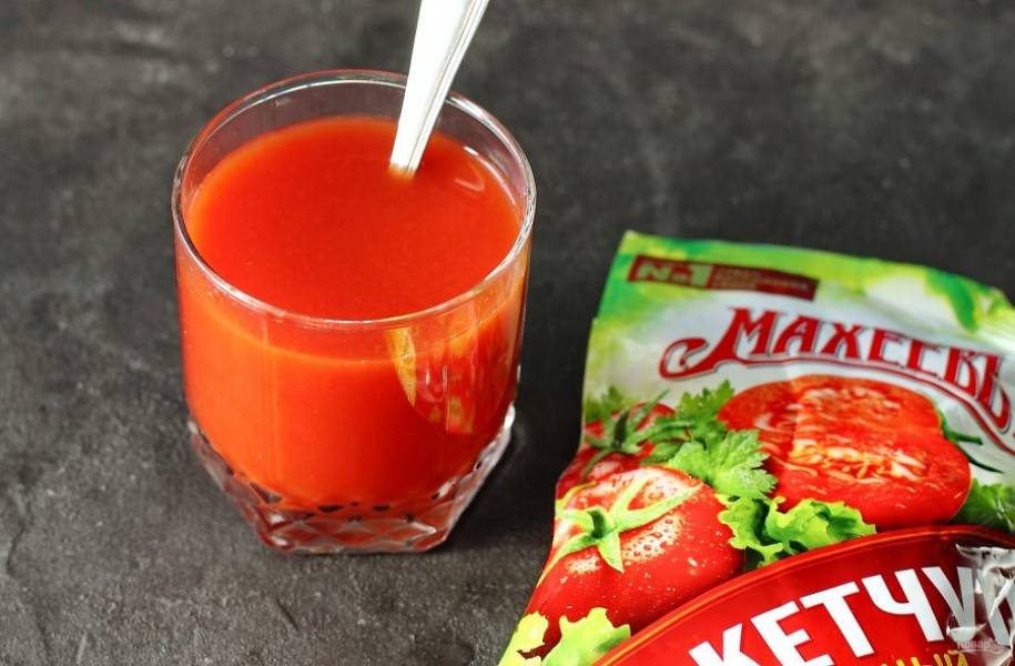 Отмерьте необходимое количество кетчупа и добавьте горячую воду, чтобы получился один стакан томатного соуса.