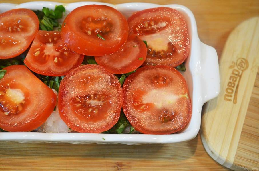 На рыбу выложите нарезанную зелень, затем нарезанные кружками помидоры.