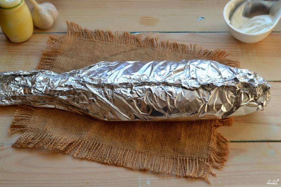 Заверните рыбку в 2-3 слоя фольги и отправьте в горячую духовку. Через 20-25 минут разверните фольгу и проткните рыбку спичкой, если она свободно войдет, значит, рыбка готова. Теперь нужно придать ей аппетитную корочку, для этого оставьте ее в духовке еще на 10 минут, не заворачивая в фольгу.