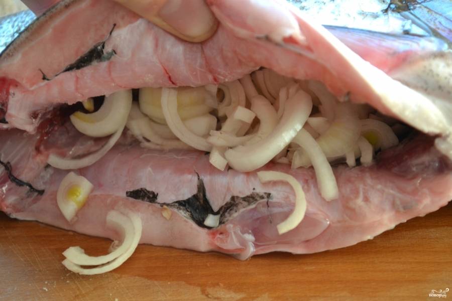 Заполните брюхо толстолобика луком, помолите и поперчите.