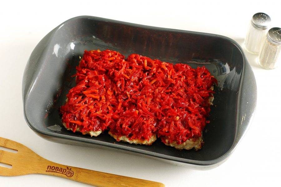 В другой сковороде обжарьте тертую на крупной терке свеклу и морковь. Когда овощи обжарятся, добавьте немного воды и тушите до готовности. В конце добавьте соль по вкусу и полейте овощи небольшим количеством лимонного сока.