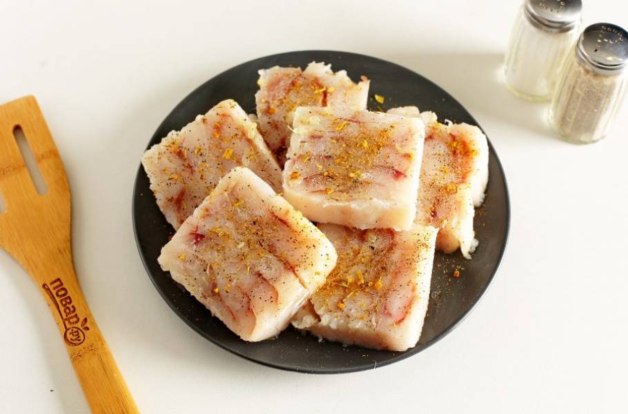 Рыбное филе нарежьте на порционные кусочки, посыпьте солью, специями и полейте соком лимона.