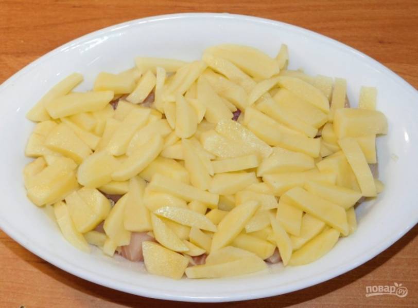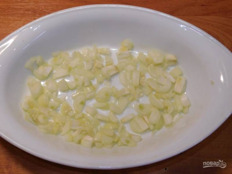 В смазанную форму для запекания выложите мелко нарезанный лук.