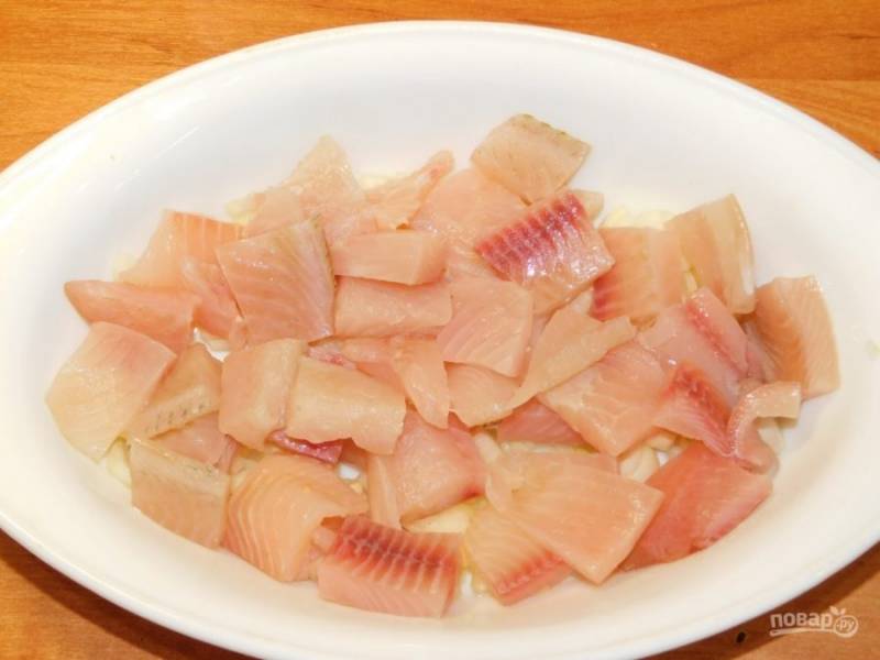 Затем выложите рыбу, нарезанную на кусочки. Сбрызните её немного лимонным соком.