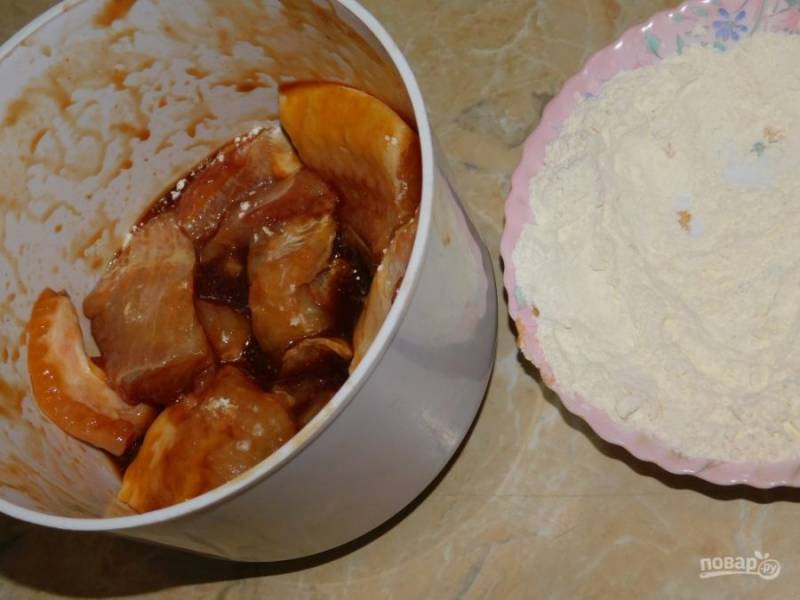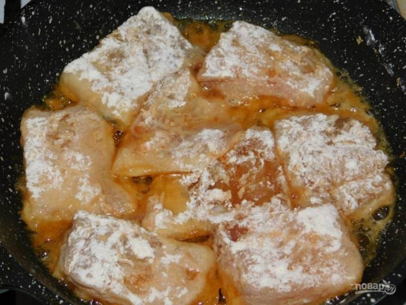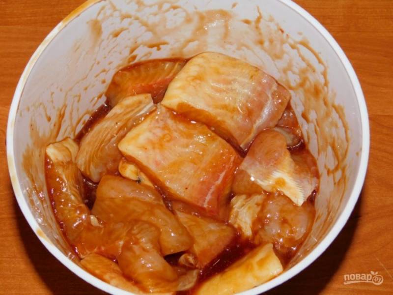 Рыбу нарежьте на кусочки и замаринуйте в соусе. Оставьте постоять на 2-3 часа.