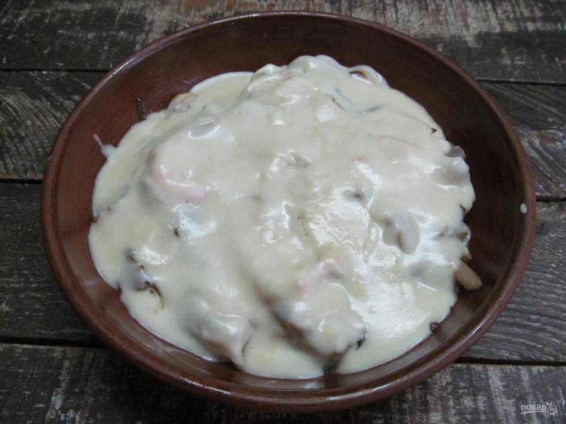 Влейте молоко, перемешайте, чтобы не было комочков. Затем добавьте сливки, сметану и тертый чеснок. Доведите до кипения, перемешивая, посолите и поперчите.