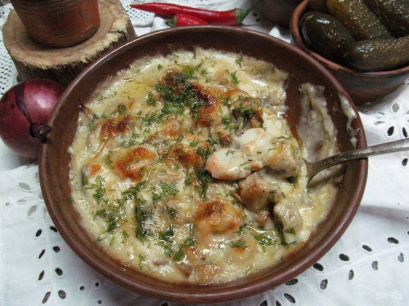 Пока варится картофель, нужно нарезать лук полукольцами и грибы кусочками среднего размера. Нагрейте масло в сковороде и обжарьте лук с грибами до румяной корочки, чуть посолите и поперчите.