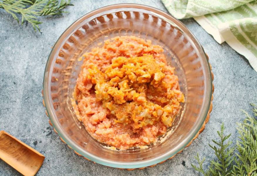Репчатый лук мелко порежьте, морковь натрите на мелкой терке и обжаривайте на растительном масле в течение 6 минут, перемешивая, остудите. Выложите овощи в фарш, перемешайте.