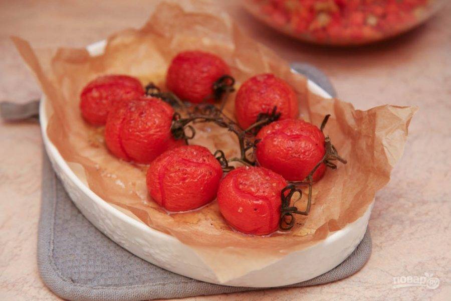Первым делом необходимо запечь томаты. Для этого вымойте их и выложите на застеленный и смазанный оливковым маслом пергамент, сбрызните маслом сверху, посолите и поперчите. Запекайте при двухстах градусах в духовке около десяти минут.
