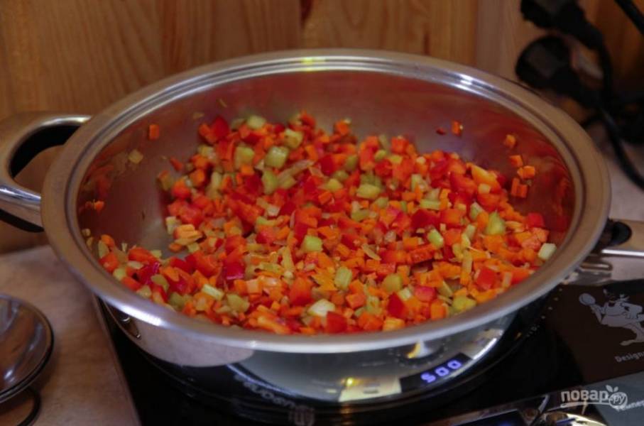 Все остальные овощи вымойте и обсушите. Очистите перец от семечек, лук от шелухи, морковь от кожуры. Нарежьте все овощи кубиками. Влейте в сковороду оливковое масло и обжарьте на нем овощи до полуготовности с веточкой розмарина.
