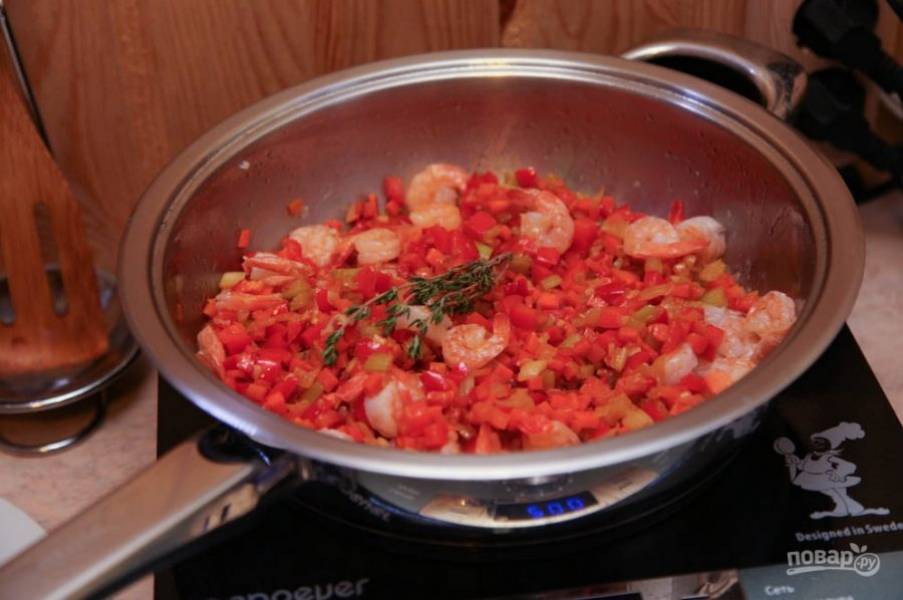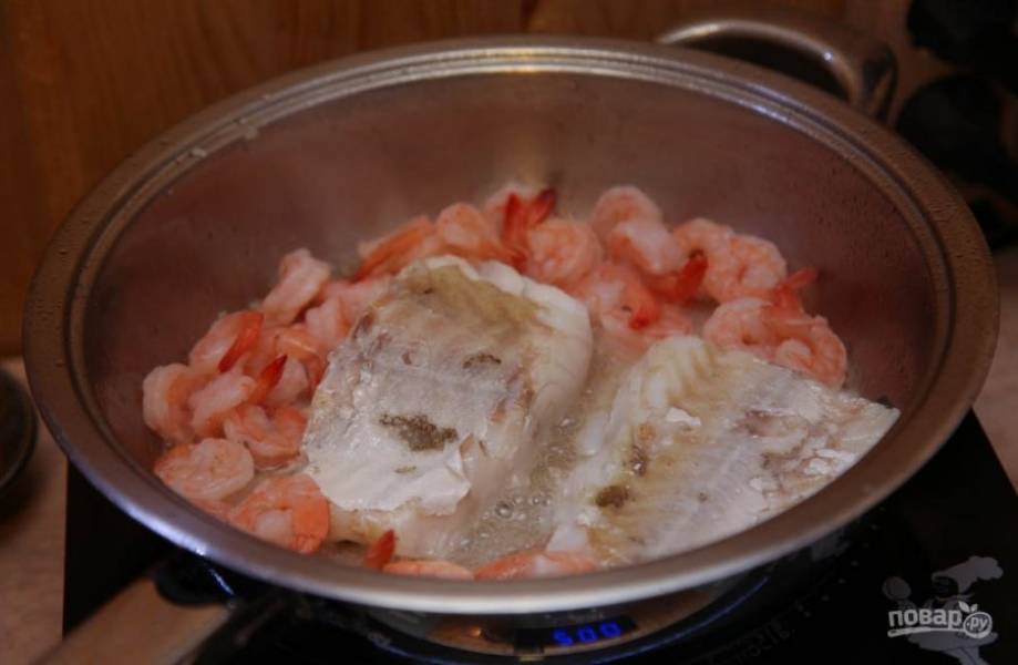 Креветки разморозьте и очистите. Добавьте их к рыбе и также обжарьте в течение нескольких минут. Если креветки были сырыми, то на это уйдет немного больше времени.