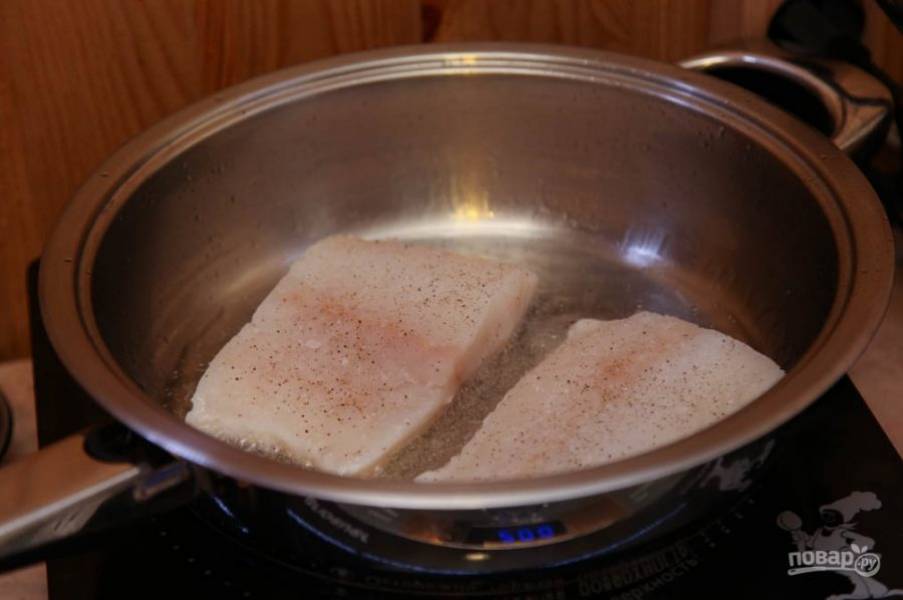 Филе трески вымойте и обсушите бумажными полотенцами. Затем зачистите филе от косточек и натрите солью и перцем. Обжарьте его до золотистой корочки в оливковом масле.