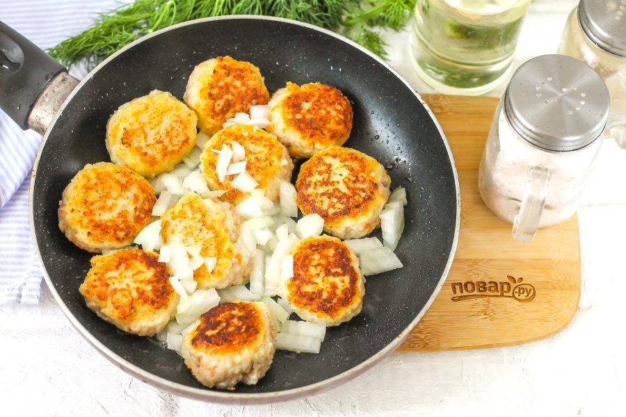 Высыпьте на сковороду оставшуюся нарезку лука и обжарьте еще 1-2 минуты.