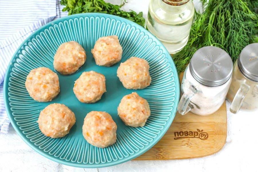 Сформируйте из фарша небольшие заготовки фрикаделек, смачивая руки в воде.