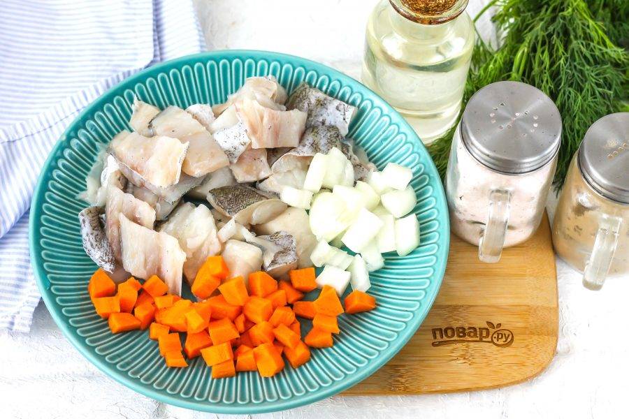 Разморозьте морскую рыбу, если приобретали ее замороженной. Очистите от чешуи, выпотрошите, промойте. Срежьте мякоть. Очистите овощи от кожуры, промойте в воде. Рыбу и овощи нарежьте кубиками, небольшими кусочками.
