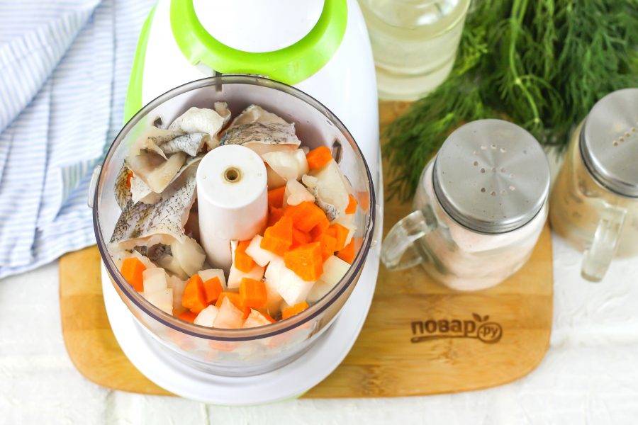 Выложите все нарезки в чашу измельчителя или кухонного комбайна, кроме половины нарезки лука — она понадобится для жарки. По желанию их можно измельчить с помощью мясорубки.
