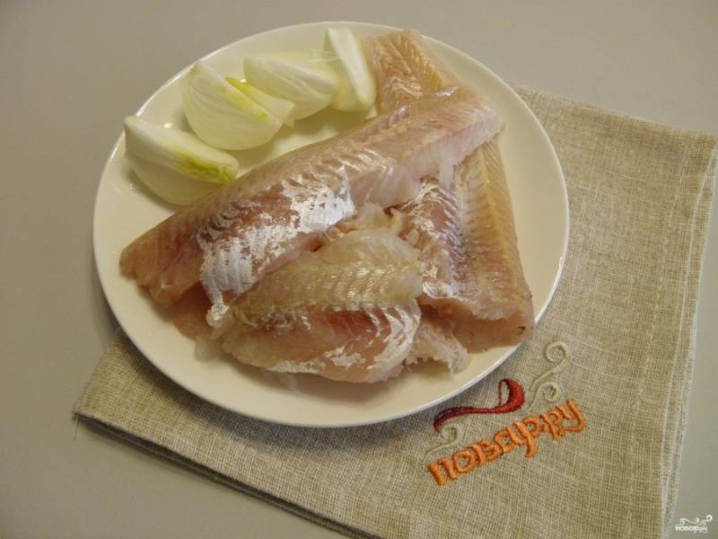 Очистите луковицу от шелухи, вымойте и порежьте её на 4 части для удобства измельчения. Вымойте тщательно рыбное филе. Если вы купили тушки без головы, снимите с них кожу и удалите внутренний хребет.